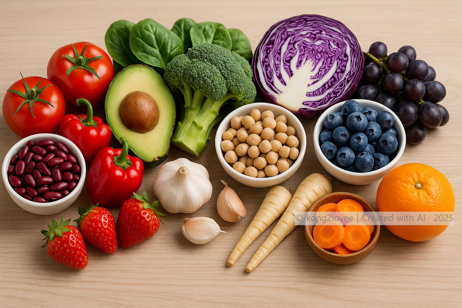 - 블루베리, 브로콜리, 당근, 김 , 고구마 등 색이 뚜렷한 채소와 과일은 세포를 손상시키는 물질을 중화해 줍니다.