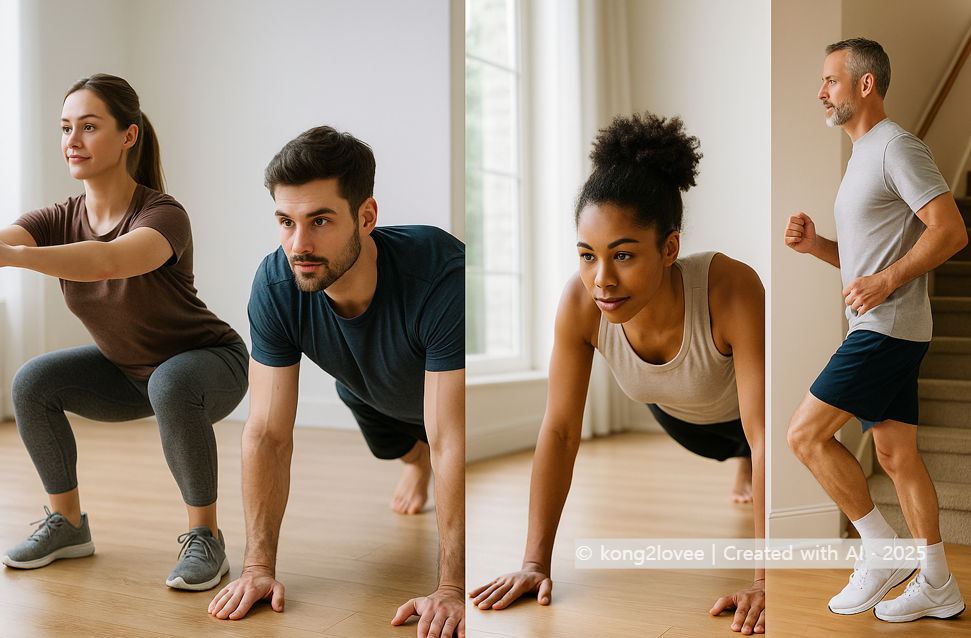 - 주 3회 이상 가볍게 스쿼트, 걷기, 플랭크, 계단 오르기 등을 해보세요.